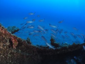 沈船まわりに色々魚が集まっています